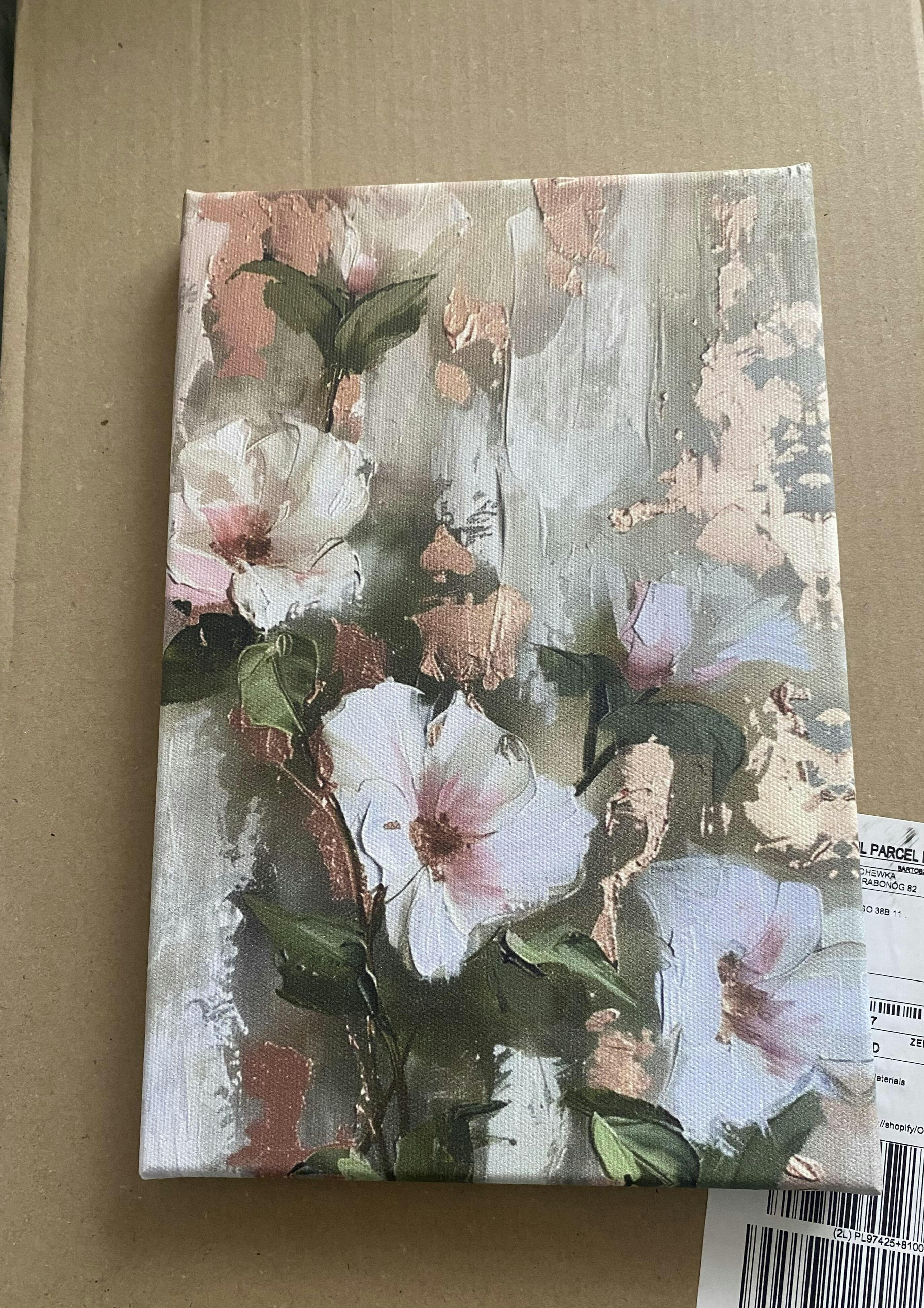 Elegancka, nowoczesna kompozycja botaniczna w stylu malarstwa olejnego z subtelnym efektem płatków złota. Delikatne odcienie zieleni i różu na jasnym tle tworzą luksusowy, ale nienachalny akcent do wnętrz. Idealny wybór do aranżacji w stylu soft glam, japandi lub boho deluxe.