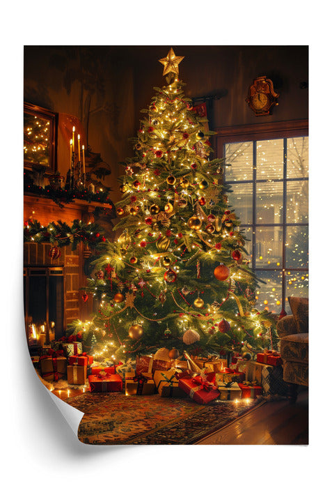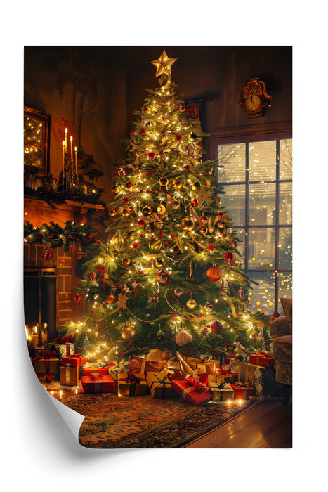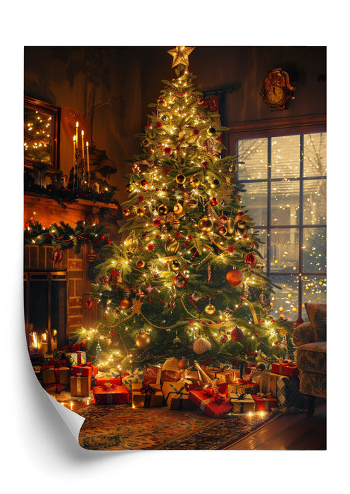 Realistyczny obraz olejny ukazujący choinkę udekorowaną światełkami, ozdobami i girlandami w przytulnym salonie. Ciepłe światło świec i miękkie promienie słońca podkreślają każdy detal gałązek i dekoracji, tworząc świąteczną, zachęcającą atmosferę pełną domowego ciepła i radosnego nastroju.