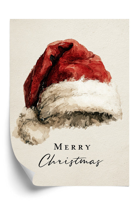 Subtelna akwarelowa ilustracja przedstawiająca czerwoną czapkę Świętego Mikołaja z miękkim, białym futerkiem i delikatnymi cieniami, utrzymana w minimalistycznym stylu. Na kremowo-beżowym tle widnieje napis „Merry Christmas” elegancką, brązową czcionką. Prosta, artystyczna kompozycja w stonowanych barwach ziemi emanuje ciepłem, spokojem i świąteczną elegancją w stylu klasycznej kartki bożonarodzeniowej.
