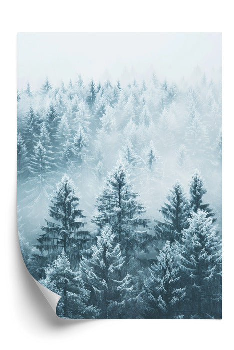 Minimalistyczna ilustracja zimowego lasu spowitego mgłą, gdzie sosnowe drzewa są pokryte śniegiem. Stonowane niebiesko-szaro-białe tonacje i spokojna, eteryczna kompozycja tworzą wyciszony, marzycielski nastrój. Obraz utrzymany w wysokiej jakości stylu plakatowym z subtelną fakturą przypominającą papier artystyczny.