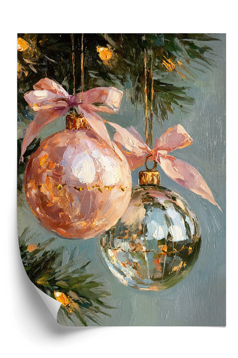 Impresjonistyczny obraz olejny przedstawiający eleganckie świąteczne ozdoby zawieszone na gałęzi iglaka. Różowa szklana bombka i przezroczysta ozdoba odbijają delikatne światło, a satynowe kokardy i złote światełka tworzą romantyczny, świąteczny nastrój. Pastelowa paleta barw, grube impastowe pociągnięcia pędzla i subtelna faktura nadają dziełu luksusowy, miękki i marzycielski charakter.