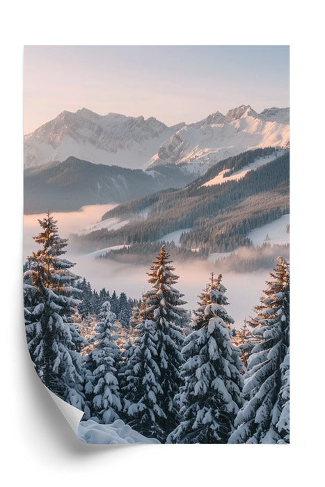 Realistyczne zdjęcie przedstawiające majestatyczny, ośnieżony górski krajobraz o wschodzie słońca. Delikatna mgiełka unosi się nad doliną, a w pierwszym planie widać sosny pokryte śniegiem. Subtelne pastelowe barwy nieba i jasne, nordyckie tony tworzą spokojny, harmonijny nastrój zimowego poranka, podkreślając piękno natury w świetle naturalnym.