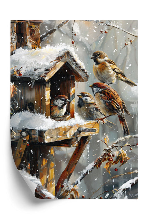 Realistyczny obraz olejny przedstawiający ptaki karmiące się przy rustykalnym, drewnianym karmniku w ośnieżonym ogrodzie. Delikatne poranne światło podkreśla fakturę piór i miękkość śniegu, tworząc ciepły, przytulny nastrój zimowego dnia. Dzieło emanuje spokojem natury i subtelnym pięknem codziennych chwil.