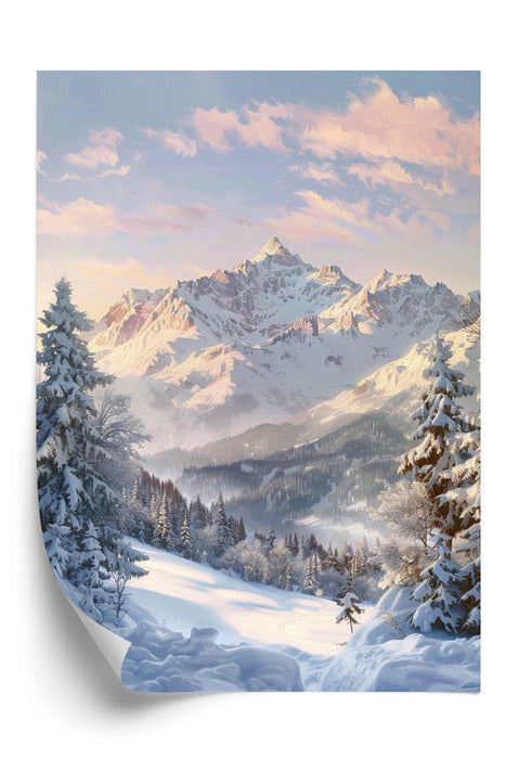 Realistyczny obraz olejny przedstawiający ośnieżone szczyty górskie o wschodzie słońca. Delikatne, pastelowe niebo i ciepłe światło odbijające się od śniegu tworzą spokojny, harmonijny nastrój. Sosny w pierwszym planie i szczegółowa faktura śniegu nadają scenie głębię, emanując przytulną, zimową atmosfer