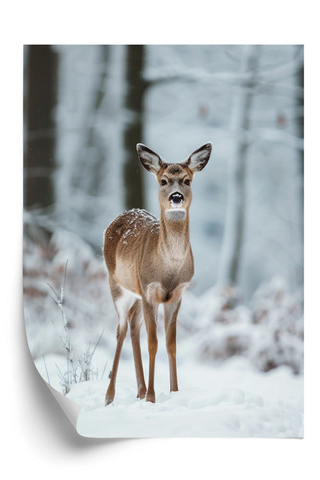 Realistyczne zdjęcie w stylu fine art ukazujące sarnę stojącą w ośnieżonym lesie. Naturalne światło i płytka głębia ostrości podkreślają delikatne detale futra i widoczny oddech w zimnym powietrzu. Subtelne, stonowane barwy tworzą spokojną, nordycką atmosferę zimowego krajobrazu.