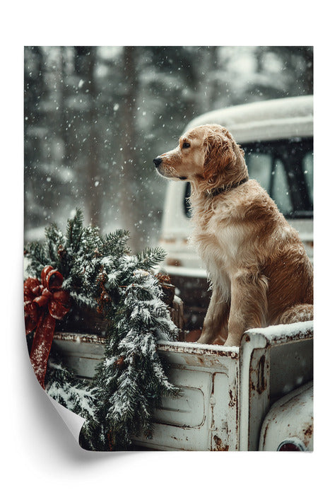 Realistyczne zdjęcie przedstawiające golden retrievera siedzącego w tylnej części vintage’owego, białego pickupa, spoglądającego na ośnieżony las. Na tylnej klapie wisi duży, śnieżny wieniec z czerwonym kokardą. Delikatnie padający śnieg, rozmyte tło zimowego lasu oraz stonowane zimowe kolory tworzą nostalgiczną, świąteczną atmosferę pełną ciepła i spokoju.