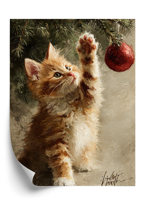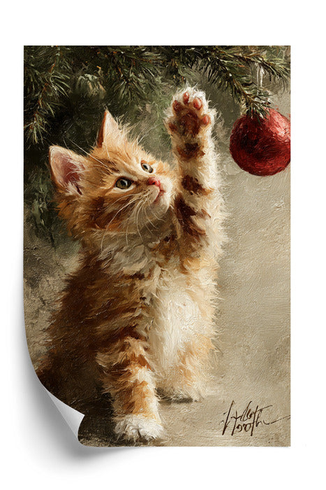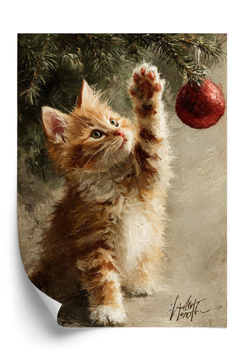 Impresjonistyczny obraz olejny przedstawiający rudego kotka sięgającego łapką do czerwonej bombki zawieszonej na gałązce choinki. Subtelne, kremowo-beżowe tło i miękkie pociągnięcia pędzla tworzą ciepły, świąteczny nastrój. Kompozycja w stylu vintage, z przytulną paletą barw i drobnymi akcentami zieleni i czerwieni, emanuje zabawną, magiczną atmosferą świąt.