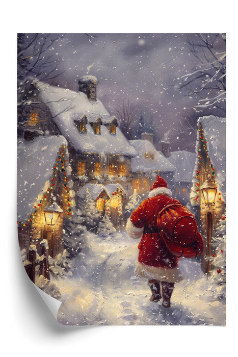 Realistyczny obraz olejny przedstawiający Świętego Mikołaja spacerującego ośnieżonymi uliczkami wioski z wielkim czerwonym workiem prezentów. Ciepłe światło lamp ulicznych i przytulne, zaśnieżone dachy tworzą magiczną, świąteczną atmosferę. Detale i miękkie pociągnięcia pędzla podkreślają urok zimowego wieczoru, emanując radością i świątecznym ciepłem.