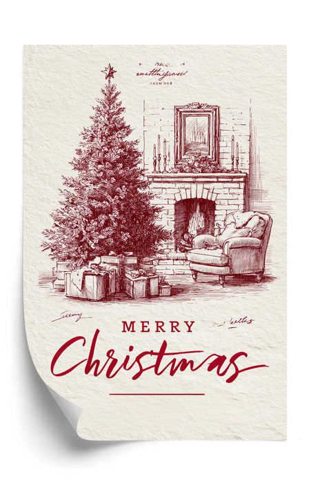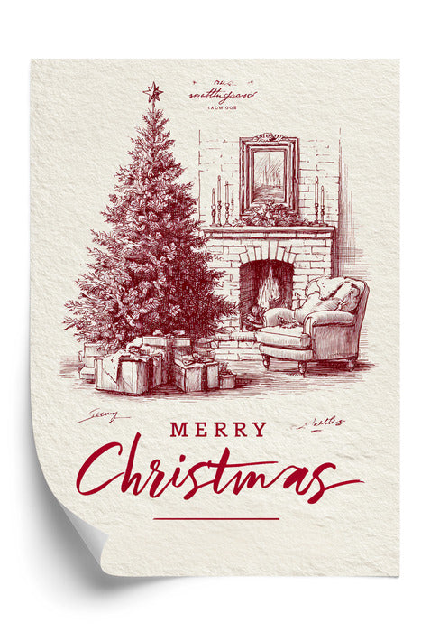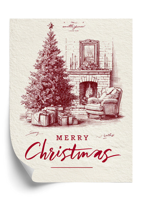 Retro ilustracja w stylu grawerunku przedstawiająca przytulny świąteczny kącik: udekorowaną choinkę z gwiazdą na czubku, prezenty pod nią, ceglany kominek z płomieniami, wygodny fotel z poduszką, lustro w ramie i świece na gzymsie. Na tle kremowego, teksturowanego papieru ilustracja wykonana jest atramentem w bordowym odcieniu, z dodatkiem śnieżynkowych ozdób. Napis „MERRY Christmas” w połączeniu pogrubionych liter i eleganckiego kursywy tworzy klasyczny, nostalgiczny klimat świątecznej kartki.