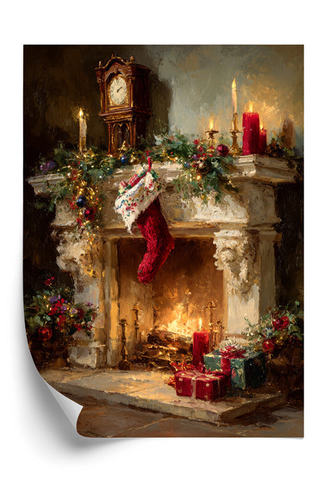Realistyczny obraz olejny przedstawiający klasyczną świąteczną scenę przy kominku. Czerwono-biała skarpeta pełna prezentów wisi na ozdobnym białym gzymsie, nad którym migoczą złote światła girlandy z igliwia i kolorowe ozdoby. Ciepłe płomienie, czerwone świece i vintage’owy zegar tworzą przytulny, nostalgicznym nastrój świąt w klimacie kartek bożonarodzeniowych.