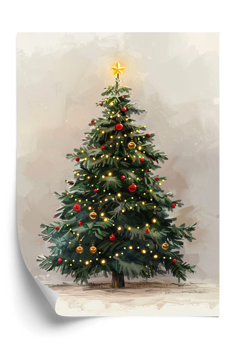 Obraz w stylu gouache przedstawiający elegancką choinkę z prostymi dekoracjami i ciepłym światłem. Subtelne, rozproszone światło podkreśla teksturę igliwia i ozdób, tworząc przytulny, nowoczesny świąteczny nastrój. Styl minimalistyczny i stonowana paleta barw nadają dziełu elegancję i spokój zimowego wnętrza.